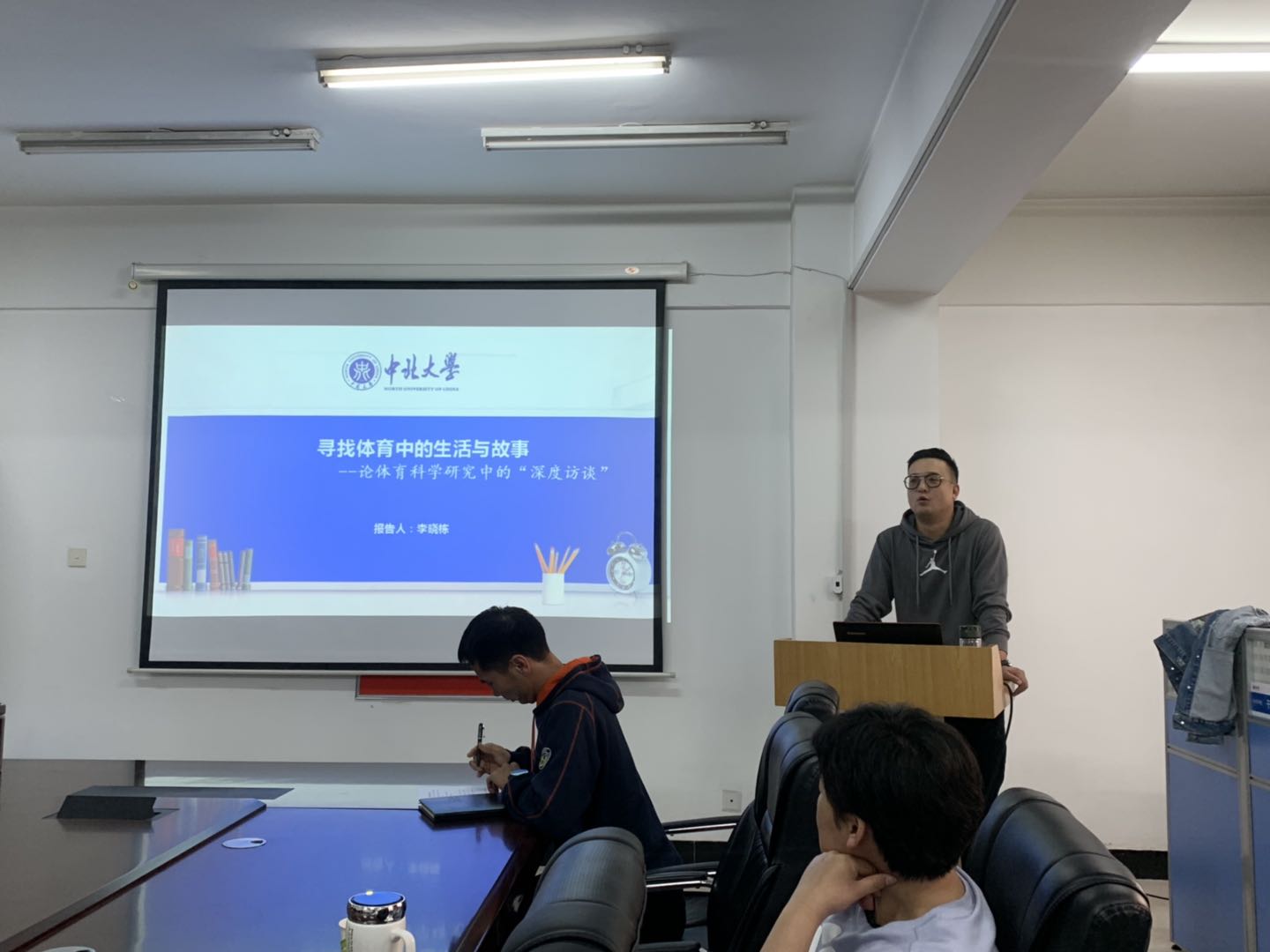 本期体育沙龙主题为“寻找体育生活中的生活与故事—论体育科学与研究中的深度访谈”。沙龙持续了一个多小时,李老师生动透彻地讲授深度访谈的背景、意义,分享深度访谈的故事,明确深度访谈的原则。为研究生论文写作提供了建设性的指导。会后同学们积极提问,老师答疑解惑,沙龙⽓氛活跃。