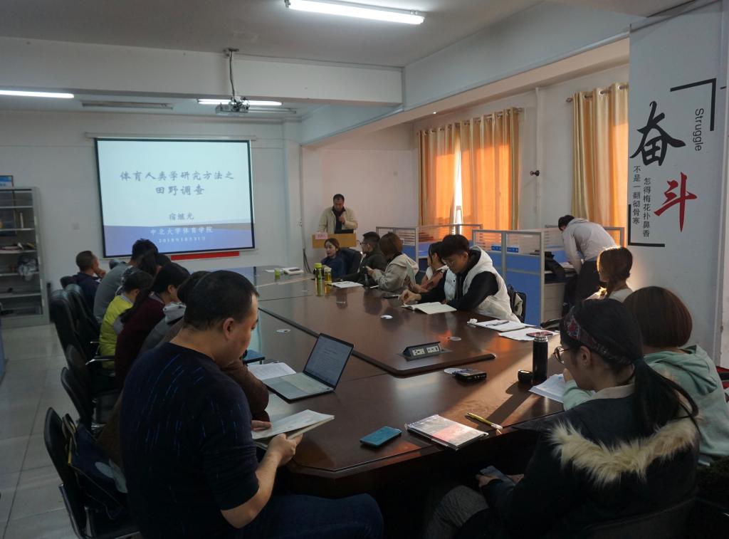 本期体育沙龙主题为“体育人类学研究方法之田野调查”。沙龙持续了一个半小时,在沙龙中宿老师深入简出的讲授了田野调查法的提出背景,阐述了应用田野调查方法应该注意的几点问题以及出现这些问题的成因分析,并对同学们做学术研究提出美好期寄。尤其强调在做田野调查时注意深入参与,成为局内人或“自己人”才能体会体育技术背后的文化内涵,用亲身感悟验证访谈的真实性,并推动当地民俗体育的发展。大家就田野调查方法产生的疑问,跟老师进行了热烈的讨论,将整个学术沙龙的气氛推向了高潮。