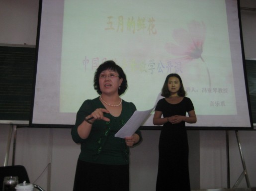 担任本次公开讲学活动的授课人是我系冯亚琴教授。冯亚琴教授为蒙古族人,现担任山西省政协常委、山西省音乐家协会理事、山西省少数民族宗教委员会委员等职,是国家一级演员。她擅长民族声乐,曾在山西省大型音乐舞蹈史诗《黄河儿女情》、《黄河一方土》、《黄河水长流》中担当过重要角色,获得过中国文化部第一届民族声乐大赛山西省第一名、中国文化部第一届民族声乐大赛演唱奖、山西省艺术最高奖“杏花奖”、山西省三八红旗手、山西省少数民族先进个人等荣誉,为山西省文化事业的发展做了大量工作。