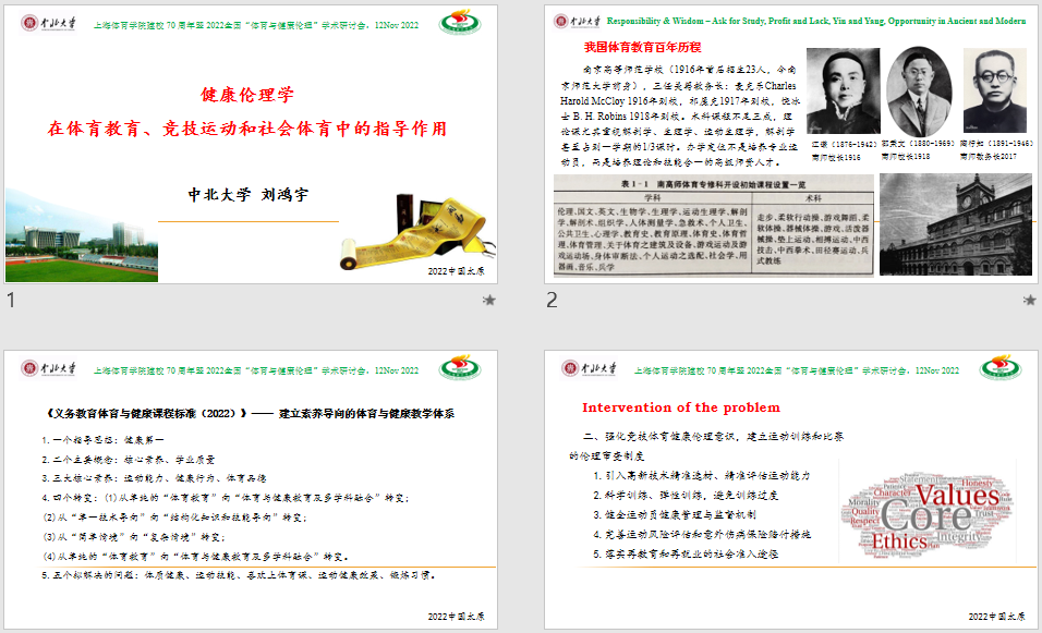 同时,他引证了百年前南京高师(现南京师范大学前身)体育专修科开设的课程中第一个就是伦理课程,北京高师(现北京师范大学前身)体育专修课的课程第一个仍然是伦理学。他认为:中国式现代化体育事业发展需要体育健康伦理学,应充分吸收母学科的知识技术、联合多学科有志者共同协作并融入教学、科研与社会服务中去,为群众体育与竞技体育提供支持。