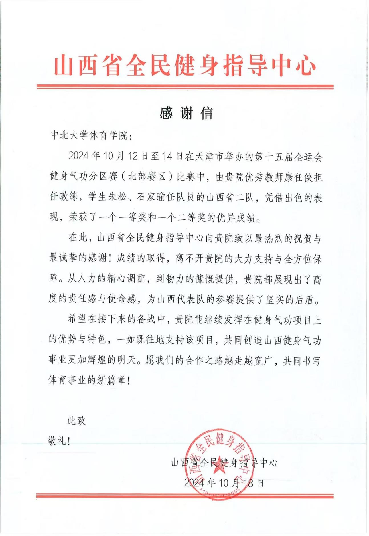 发来感谢信,对学院师生首次代表山西参加第十五届全运会健身气功分区赛(北部赛区)并取得优异成绩表示祝贺和感谢。