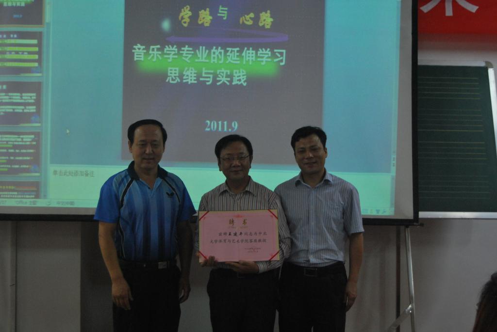 2011年9月1日,王建平教授客座中北音乐系,刘定一院长为王建平授予客座教授荣誉证书,音乐系全体师生聆听了讲座。王建平教授四十多年的教学经验和文化修养,使得在场的每个人都被宁静致雅、悸动深刻的气息感染并深深折服。
