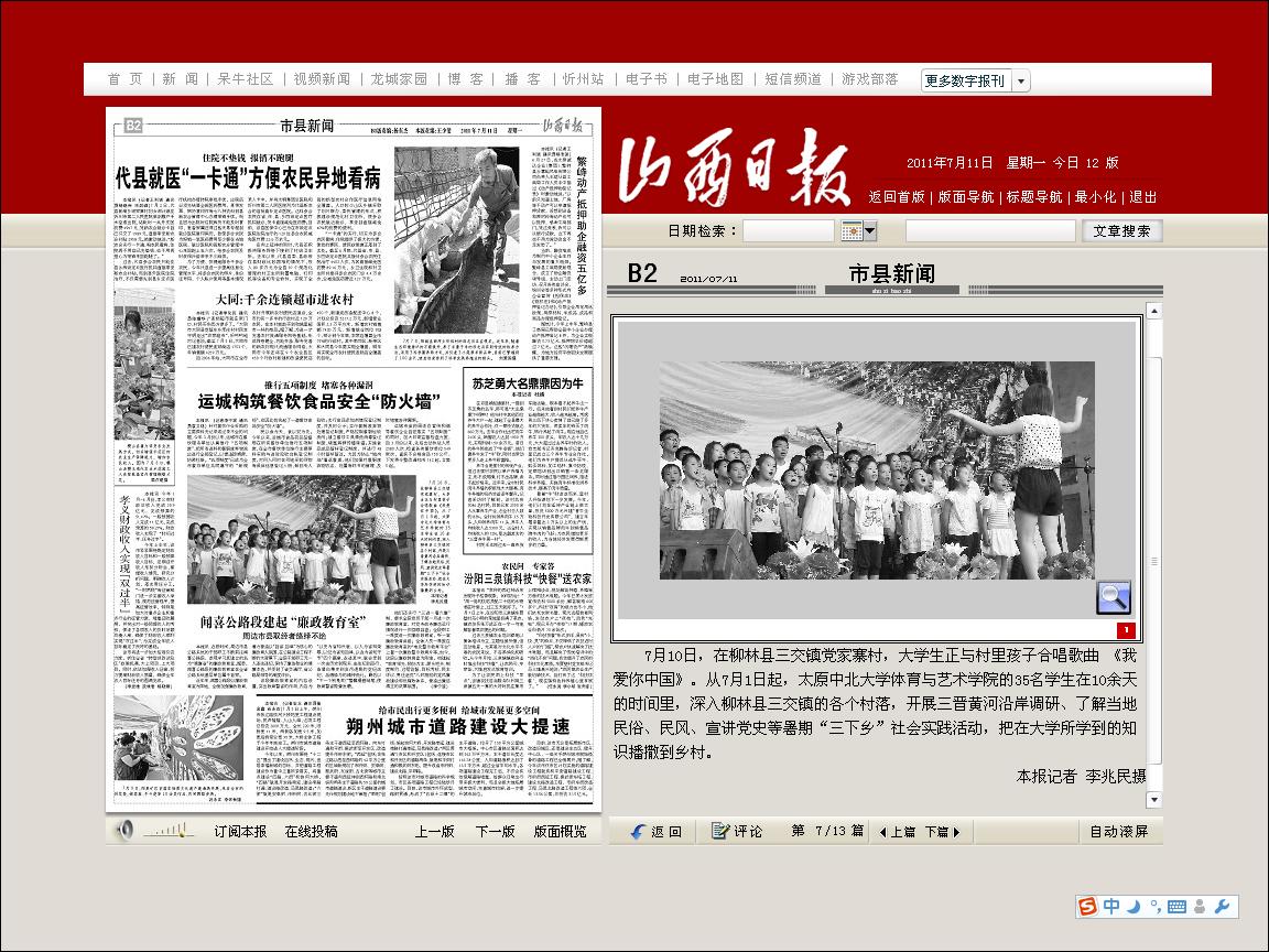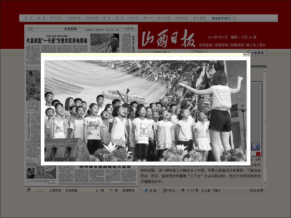 7月10日,在柳林县三交镇党家寨村,大学生正与村里孩子合唱歌曲 《我爱你中国》。从7月1日起,太原动漫花园 体育与艺术学院的35名学生在10余天的时间里,深入柳林县三交镇的各个村落,开展三晋黄河沿岸调研、了解当地民俗、民风、宣讲党史等暑期“三下乡”社会实践活动,把在大学所学到的知识播撒到乡村。 本报记者 李兆民摄