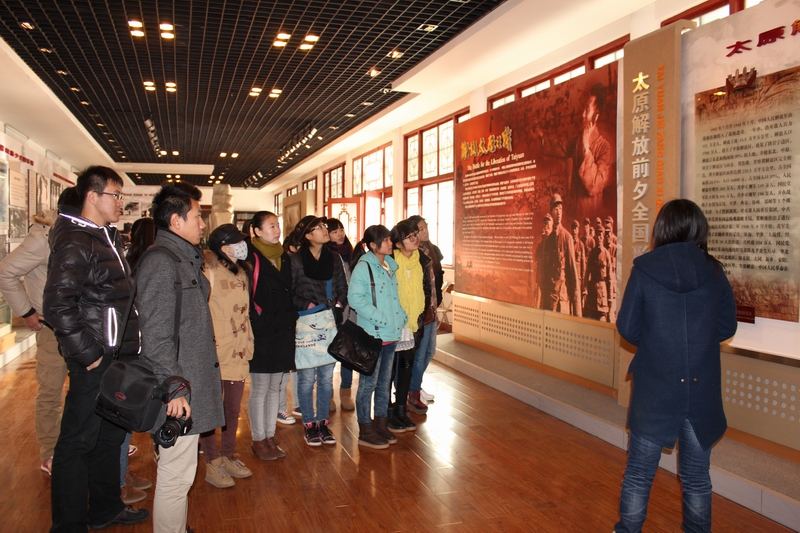 同学们胸前佩戴小白花,先来到死难烈士碑前,缅怀默哀我们的革命先驱,接着大家来到展厅,在导游的讲解下一同了解革命历史,参观在解放太原战争中的照片及物品。