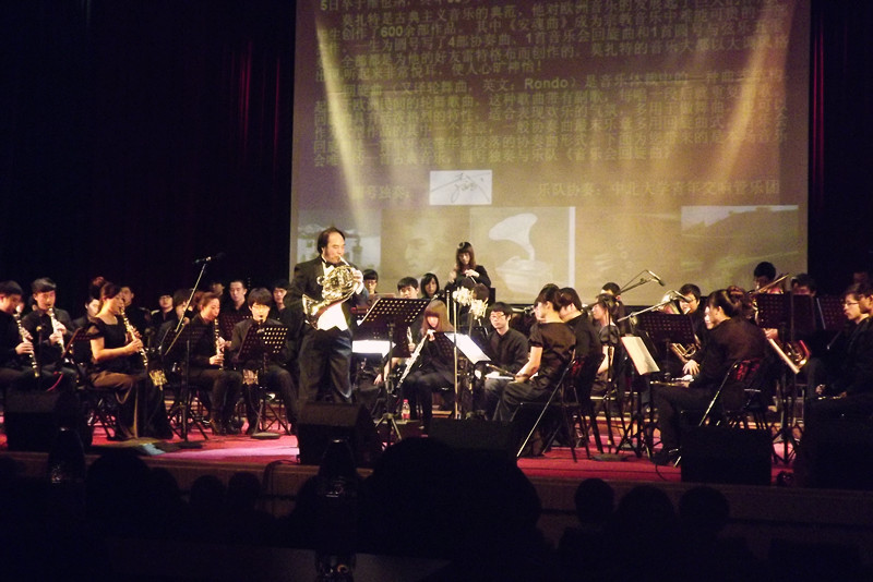 整场音乐会是由我国圆号演奏家、管乐教育家、音乐系李斌老师与他的学生主持。李斌老师讲解交响管乐队的编制与所演奏作品的时代背景以及担任整场音乐会的指挥,并独奏了三首圆号曲,李老师的讲解、指挥以及独奏,精彩纷呈,彰显了这位中年艺术家的精湛技艺和敬业精神,带动了全体演员也感染了所有观众。