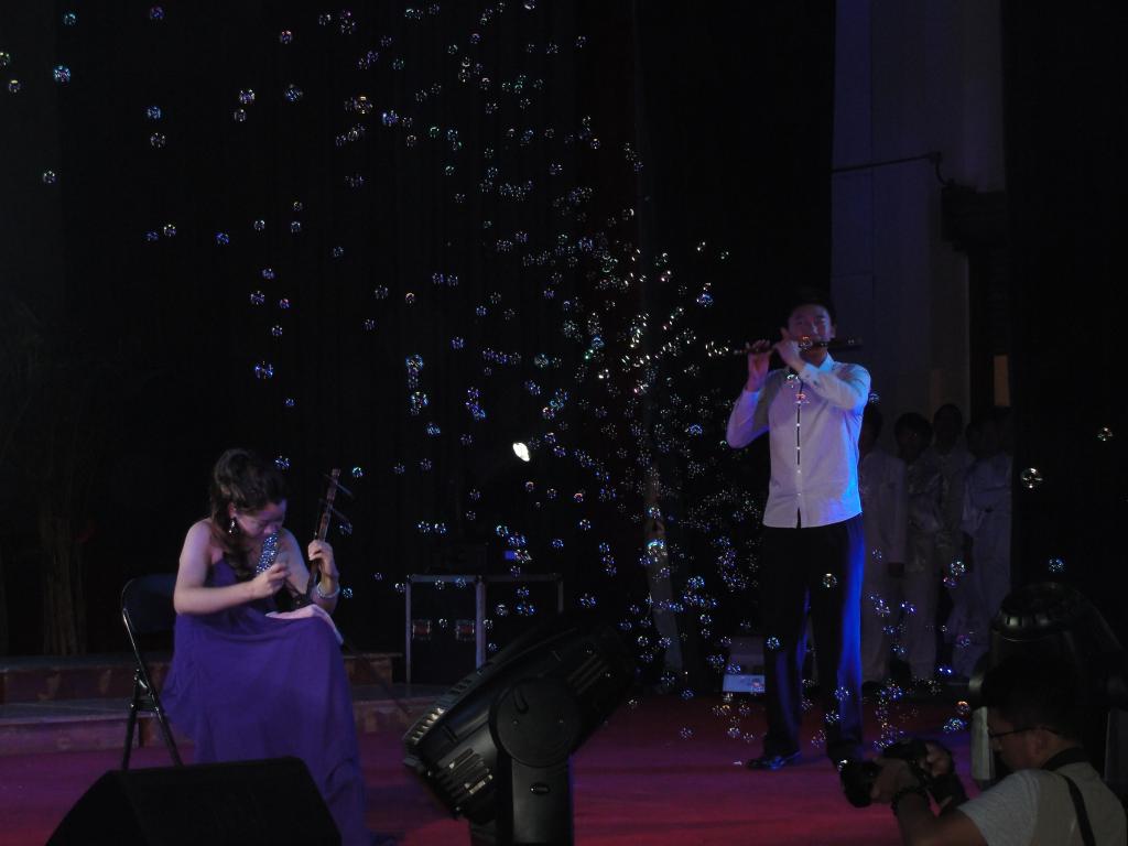 音乐会内容丰富多彩,包括管乐合奏、合唱、民乐合奏、独唱、重唱等多种形式,每一首乐曲,每位教师都以极强的表现力和对乐曲本身深刻的领悟,赋予了古典、民族、现代音乐灵动的韵律感和鲜活的生命力,让现场观众陶醉在流畅娴熟的演艺之中。由音乐系教师田军、马小娟、窦飞合作的民乐合奏曲《中北一夜》、留学俄罗斯的山西省首位声乐博士张丽珍老师演唱的《举杯吧朋友》、山西省著名歌唱家陕军老师演唱的《爱我中华》等精彩节目一次次将音乐会推向高潮。整场演出观众席座无虚席,时时爆发出热烈而持久的掌声。演出结束时,学生代表为各位老师献上鲜花。